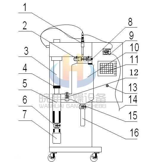 1、霧化器; 2、大卡箍; 3、尾氣管; 4、鎖緊螺母; 5、旋風(fēng)分離器; 6、1 號卡箍; 7、收集瓶;8、大卡箍; 9、蠕動泵; 10、干燥室; 11、觸摸屏;12、2 號卡箍; 13、電源開關(guān);