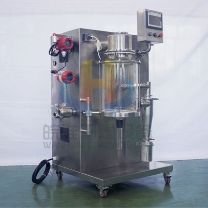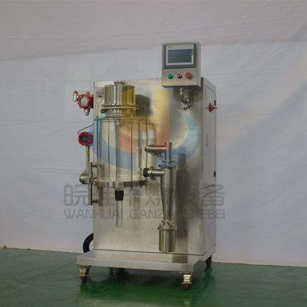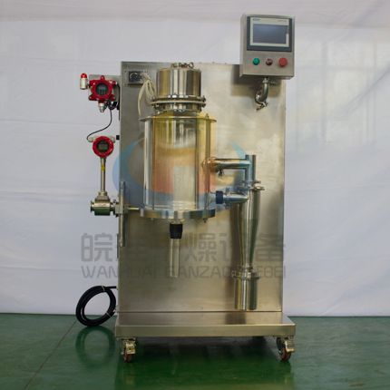 小型噴霧干燥機主要在科研階段對溶液或流體樣品進行噴霧干燥成粉或微小顆粒。其原理是通過霧化器將樣品霧化成微細霧滴,進入干燥室內進行熱交換,水份瞬間蒸發(fā),固體經過旋風分離器進行回收,飽和氣體經過除塵器過濾后排空,本設備可應用于從試驗室到一般研究室的噴霧干燥作業(yè),在食品醫(yī)藥化工行業(yè)均可良好的應用。 設備特征與設計結構: 2、噴霧后的微粉末,水分含量低、不會氧化(熱敏性物料除外)、無污染。 10、本機設計在進風口做了均風裝置,可在干燥過程中對粘性物料減少黏壁問題